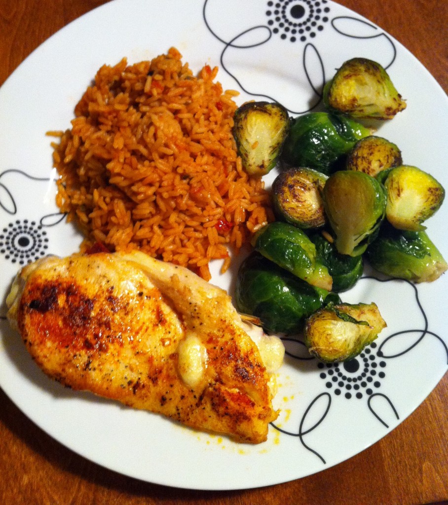 Step 6. Place rice in microwave for 90 seconds and serve with chicken and Brussels sprouts.