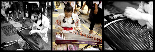 This harp soloist was captivating. She played from memory, without using any sheet music. The crowd would grow larger as she began another tune, then it would disperse at the end of the last cord. The crowd would often erupt with applause and cheers. Adults were moved by her talent and several small children were mesmerized. They sat hoisted on their parents shoulders alongside siblings and other family members. Passers-by dropped money in the black pouch that lay in front of her. Even though Mong Kok is an extremely dense and busy area, the harpist provided a very peaceful experience.