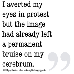 Year after year, the style just won’t die. The pants dip lower with each passing season. I see drawers at the mall, drawers at the grocery store, drawers at the gas station and now drawers at a fashion school. The style is so pervasive that states such as Florida, Tennessee, Alabama and Mississippi have crafted laws against it.Yet, I don’t agree that there should be any such law banning the sag. Instead, I want parents to get involved. I want men who wear their pants properly to take a stand. I want wearers of sagging pants to catch a clue and grip it tenaciously. I want belts to find their home back on hips. I want underwear to actually be worn under outerwear.