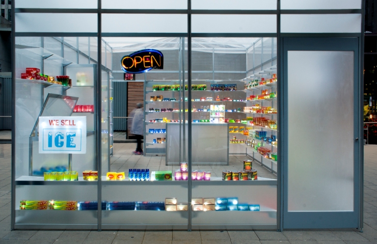 You’ll want to attend the “Late Night Convenience” by Rhonda Weppler and Trevor Mahovsky. A see-through store erected and