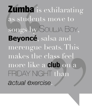 First-year fashion marketing and management student Kayla Williams comes to the class because she is familiar with Zumba. “I’ve done it before and decided to try it here,” she says. She’s only taken two classes but vows to come back.