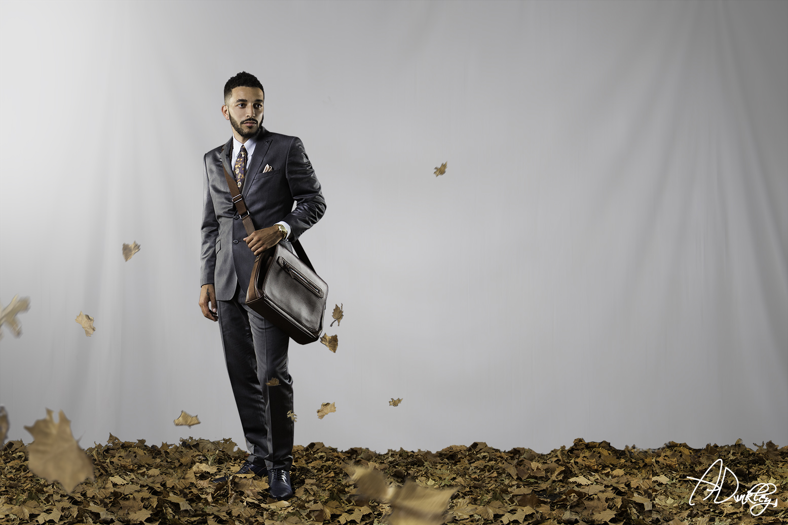 The model is wearing his own suit, a tie from a thrift store and bag and shoes from Aldo.