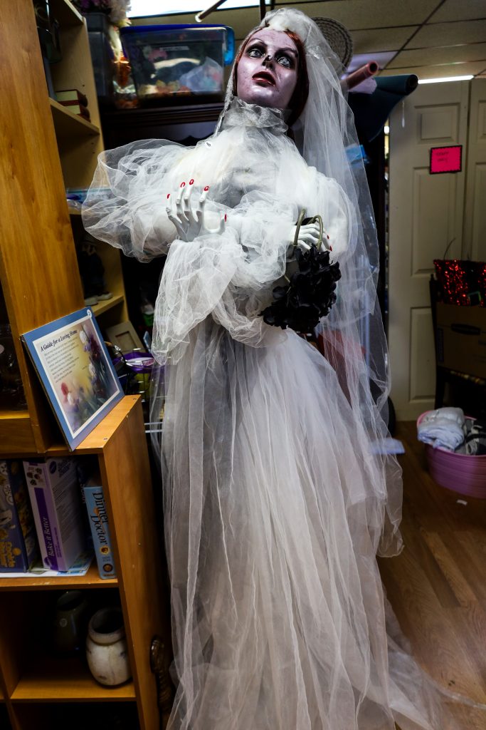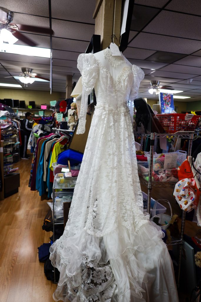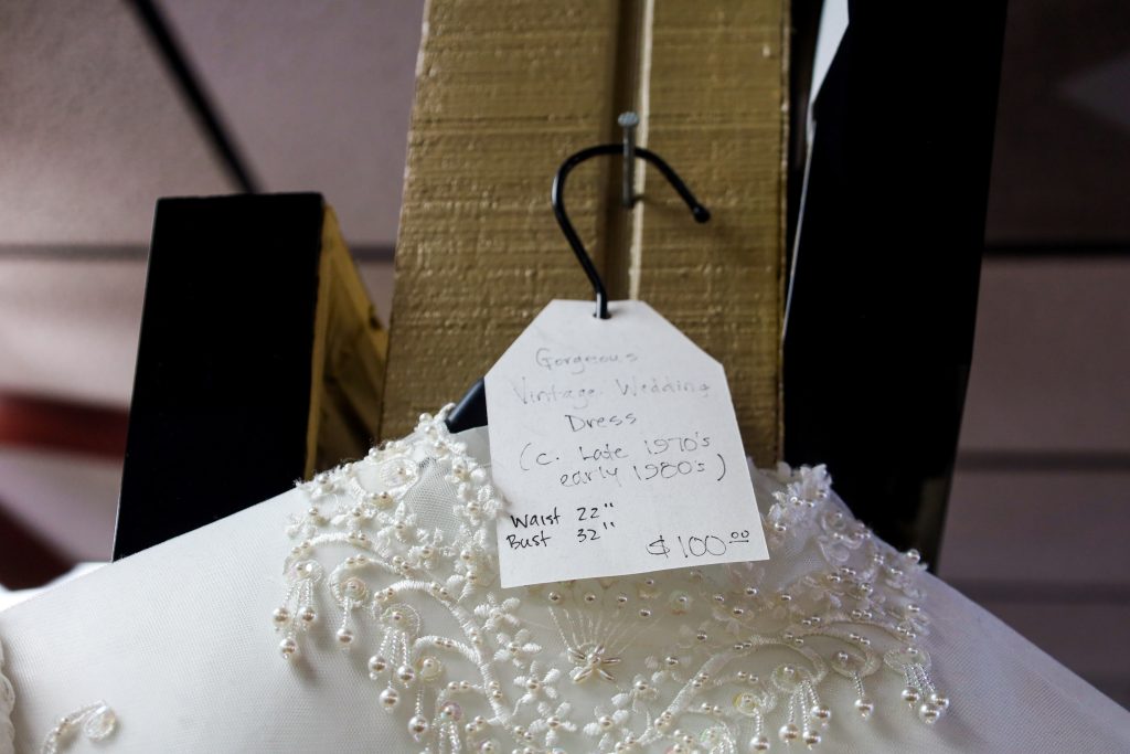 This white wedding dress really stood out. On the tag, it notes that this was a wedding dress made in the 80s. It definitely gives an 80s vibe with the blend of elegance and punk. Respectfully, I could see Chucky’s wife wearing this.