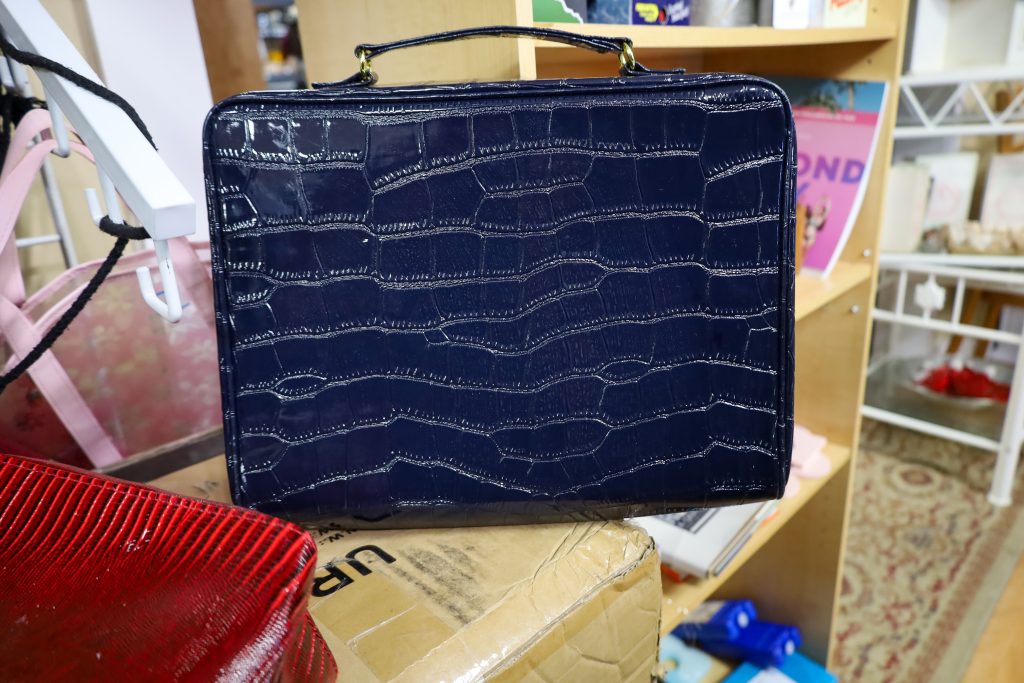 As for accessories, two small briefcase bags really caught my eye, specifically the red one. I instantly thought I could use this to carry my laptop. I loved the vibrant, bright red color with gold detailing. Not to mention the texture looked stunning. At first, I was not too thrilled with the navy-blue briefcase. It looked bland, but when I got home and looked at the picture, I realized it was actually pretty solid. I went back the next day to retrieve both bags, but only the red one was left.